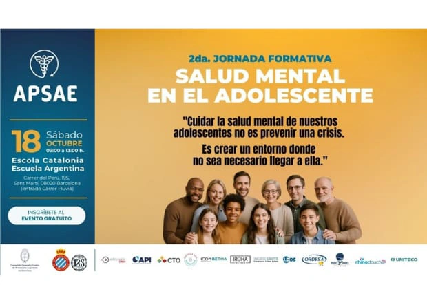 La salud mental de los adolescentes es uno de los grandes retos de nuestra sociedad. Conscientes de ello, la Asociación de Profesionales de la Salud Argentinos en España (APSAE) organiza la II Jornada Formativa sobre la Salud Mental Adolescente, que tendrá lugar el sábado 18 de octubre de 2025, de 9:00 a 13:00 horas, en la Escola Catalònia de Barcelona.